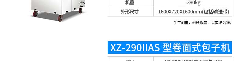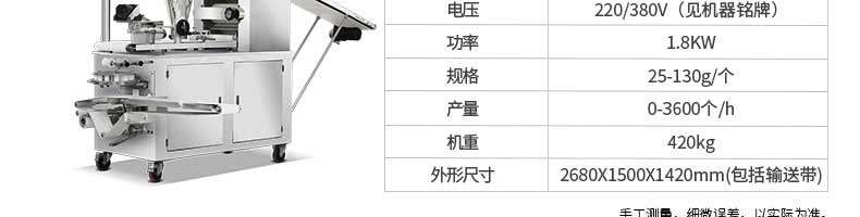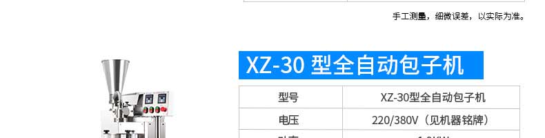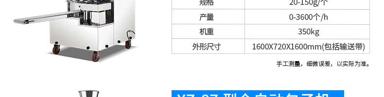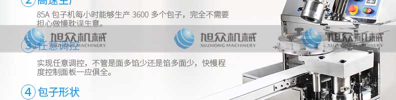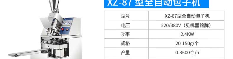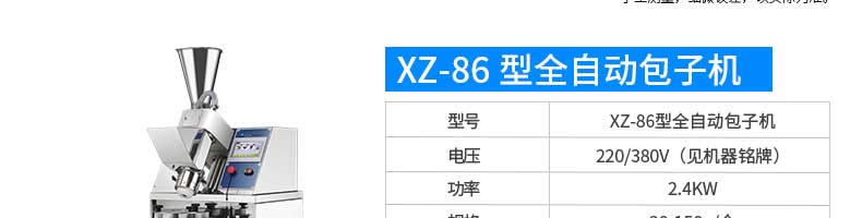 名稱XZ-85A全自動包子機(jī) 電源220/380v 功率2.4kw 產(chǎn)量 尺寸1600*720*1600mm 重量390kg 規(guī)格20-150克/只 其他