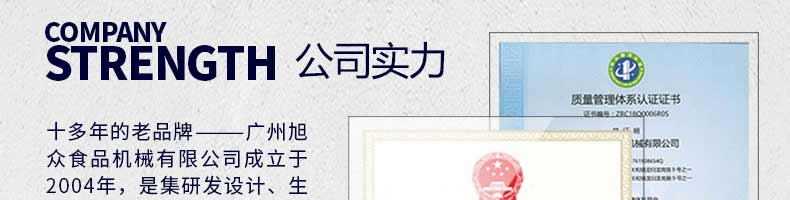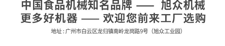廣州旭眾食品機械有限公司是一家集科研開發(fā),生產設計,營銷服務為一體的現(xiàn)代化生產企業(yè)?,F(xiàn)代化生產車間,精湛制造技術,所產機械歷經市場重重考驗,不斷贏得海內外客戶的贊譽。