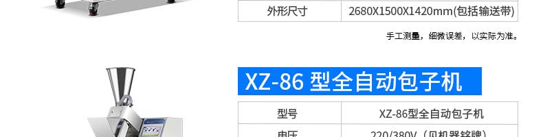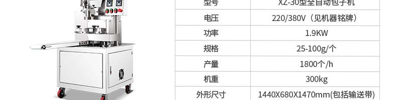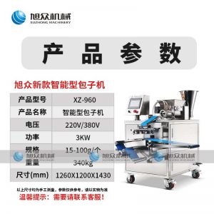 名稱XZ-960智能型包子機(jī) 電源220/380v 功率3kw 產(chǎn)量15-100g/個(gè) 尺寸1260*1200*1430mm(包括輸送帶) 重量340kg 規(guī)格 其他