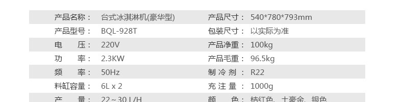 名稱BQL-928T臺式冰淇淋機 電源220V 功率2.3kw 產(chǎn)量22-30L/H 尺寸540*780*793mm 重量96.5kg 規(guī)格 其他