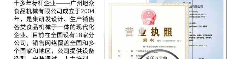 廣州旭眾食品機(jī)械有限公司是一家集科研開(kāi)發(fā),生產(chǎn)設(shè)計(jì),營(yíng)銷(xiāo)服務(wù)為一體的現(xiàn)代化生產(chǎn)企業(yè)?,F(xiàn)代化生產(chǎn)車(chē)間,精湛制造技術(shù),所產(chǎn)機(jī)械歷經(jīng)市場(chǎng)重重考驗(yàn),不斷贏得海內(nèi)外客戶(hù)的贊譽(yù)。