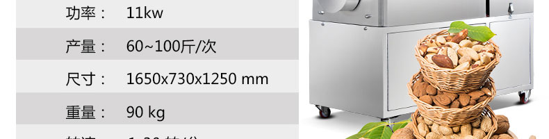 名稱豪華型100D炒貨機 電源220/380V(見機器銘牌) 功率11kw 產(chǎn)量60-100斤/次 尺寸1650*730*1250mm 重量90kg 規(guī)格 其他