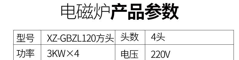 名稱XZ-TBZL120方頭臺(tái)式電磁爐 電源220V 功率3KW×4 產(chǎn)量聯(lián)系銷售員 尺寸760×830×230MM 重量聯(lián)系銷售員 規(guī)格頭數(shù):4頭 其他