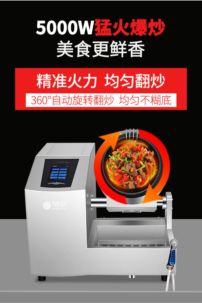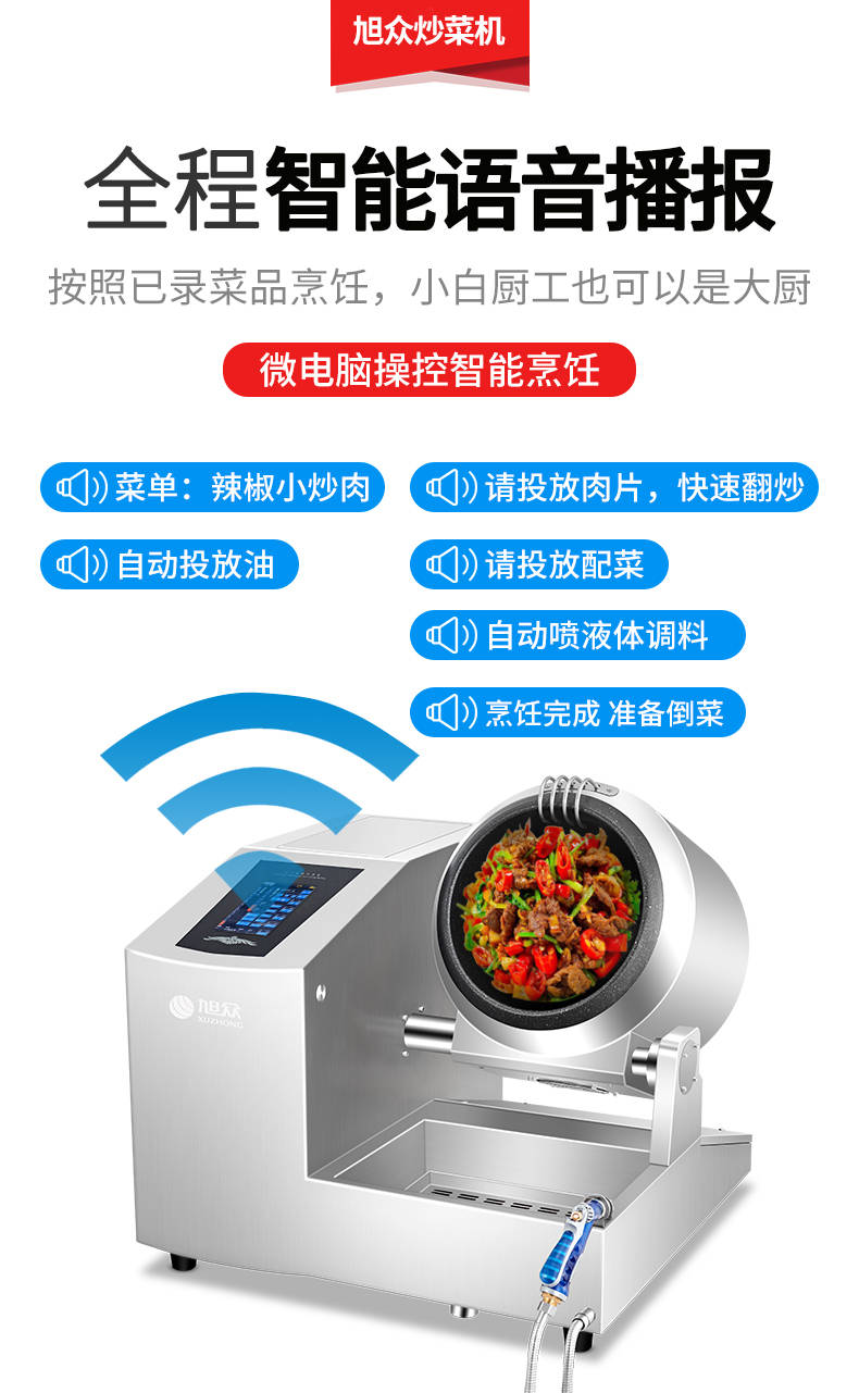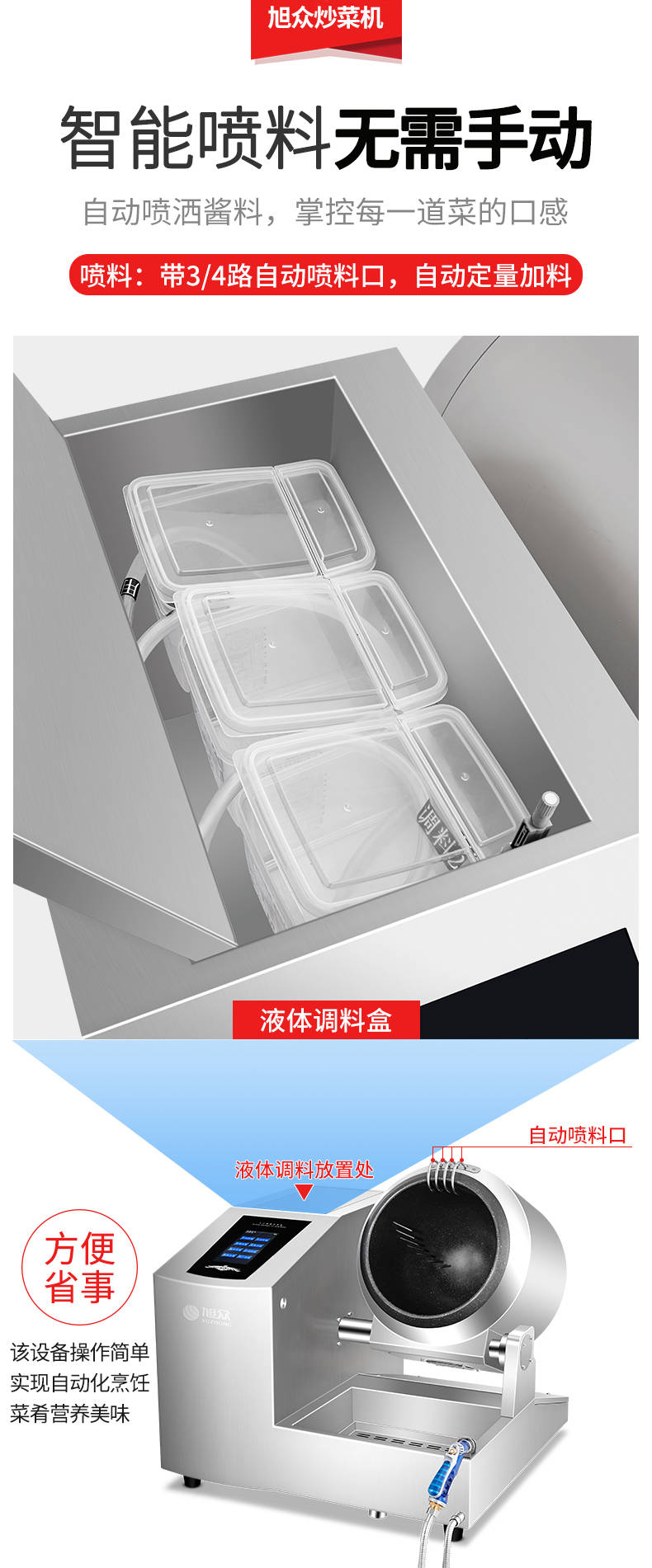 XZ-30TCP臺式300智能電磁炒菜機(觸屏+噴料),可以實現(xiàn)自動化烹飪過程的智能化設備,語音播報、自動噴料、旋轉翻炒、快速出菜。實現(xiàn)自動化烹飪,新一代微電腦操控智能烹飪設備、顛覆傳統(tǒng)炒菜模式。5000W猛火爆炒美食更鮮香