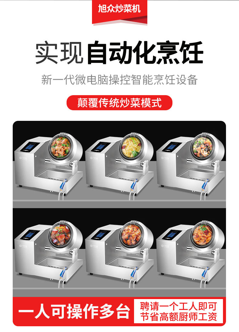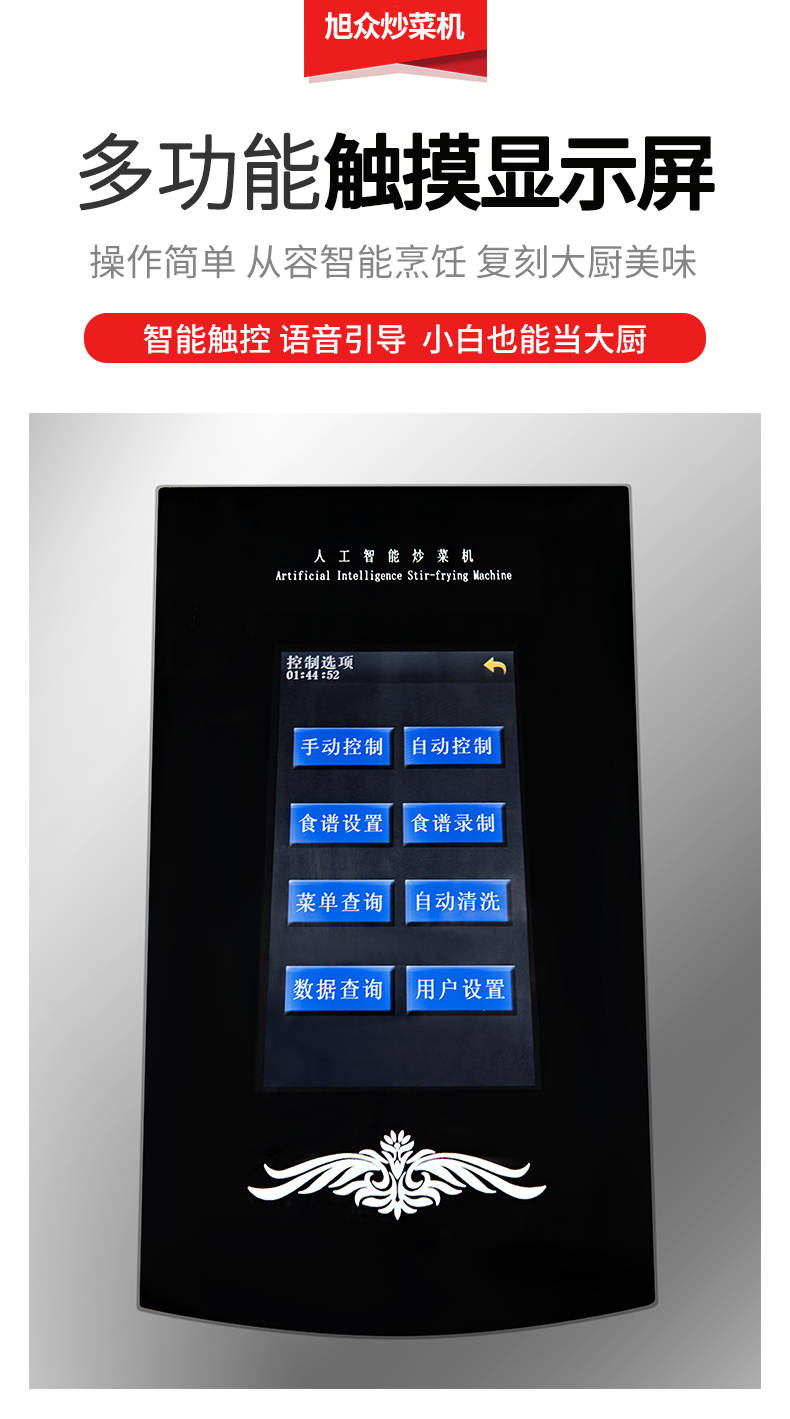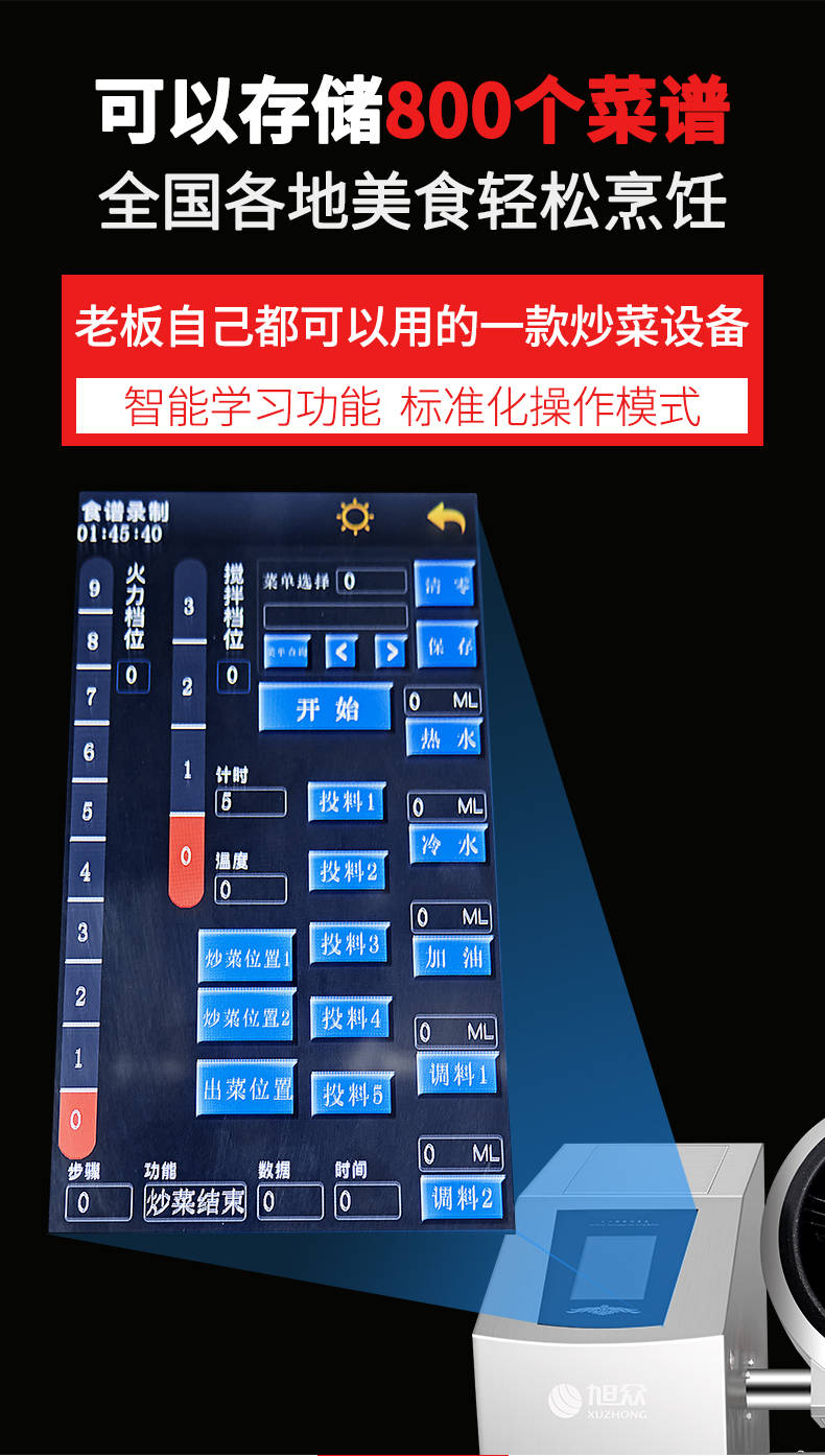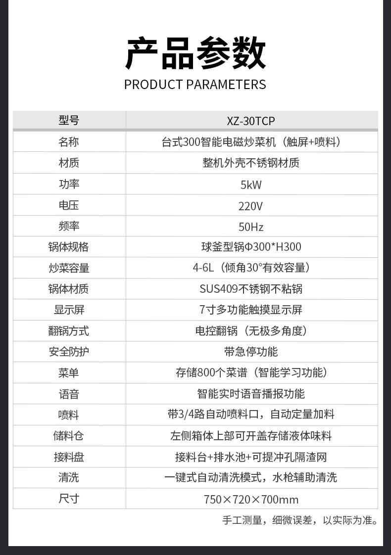 XZ-30TCP臺式300智能電磁炒菜機(觸屏+噴料),可以實現(xiàn)自動化烹飪過程的智能化設備,語音播報、自動噴料、旋轉翻炒、快速出菜。實現(xiàn)自動化烹飪,新一代微電腦操控智能烹飪設備、顛覆傳統(tǒng)炒菜模式。5000W猛火爆炒美食更鮮香