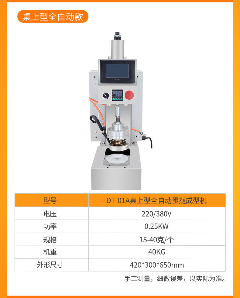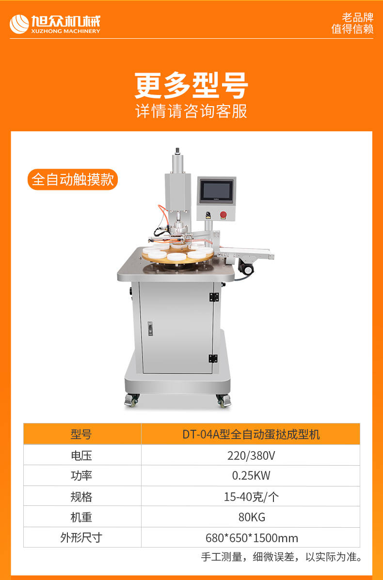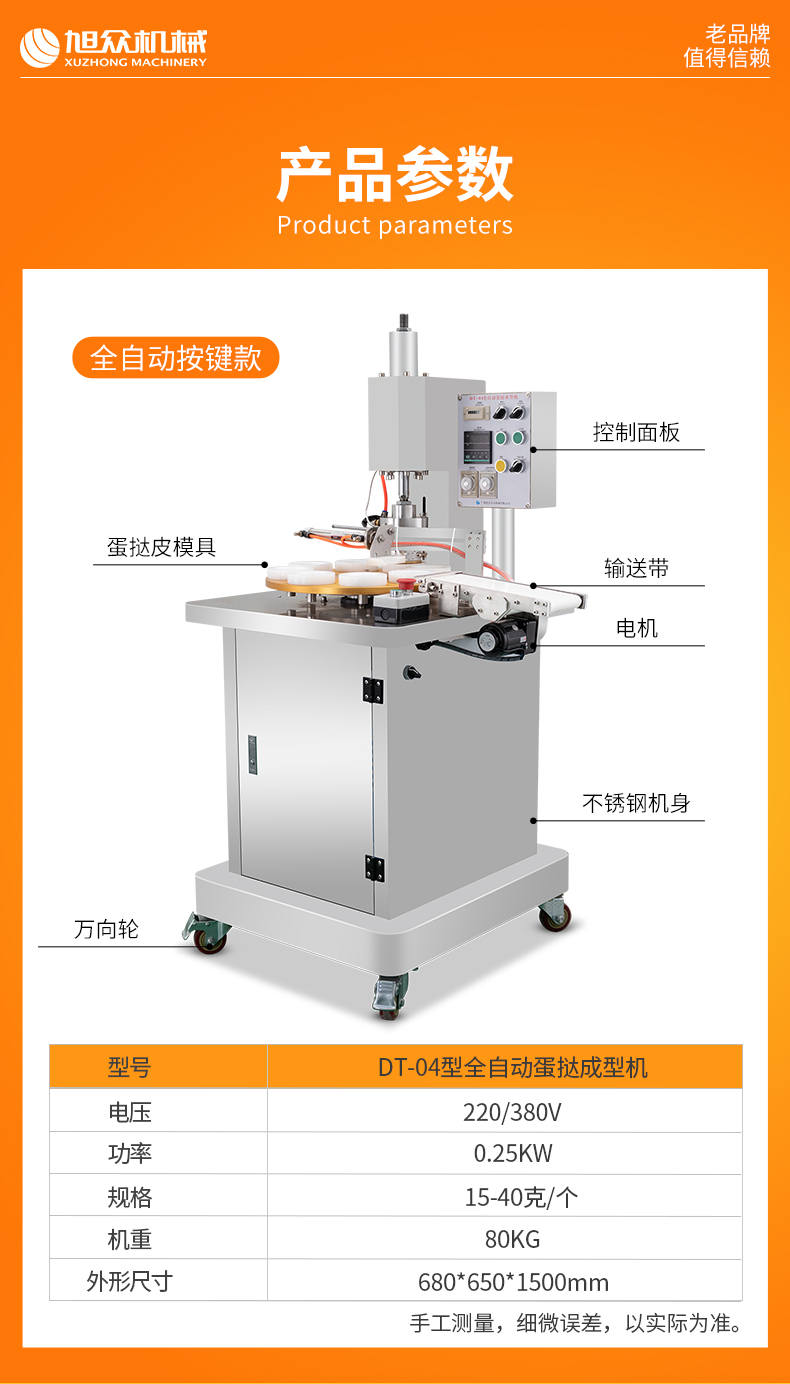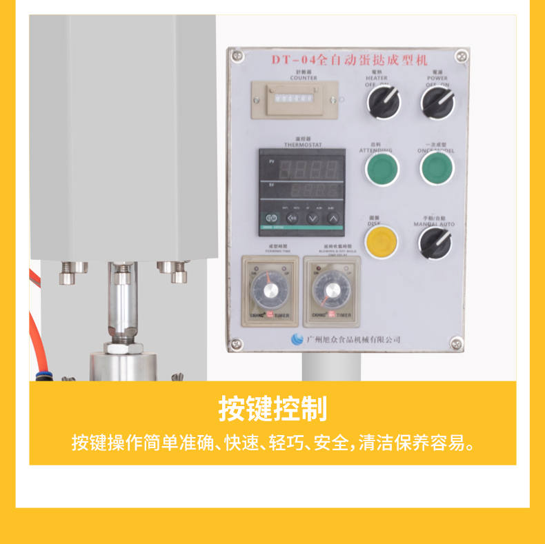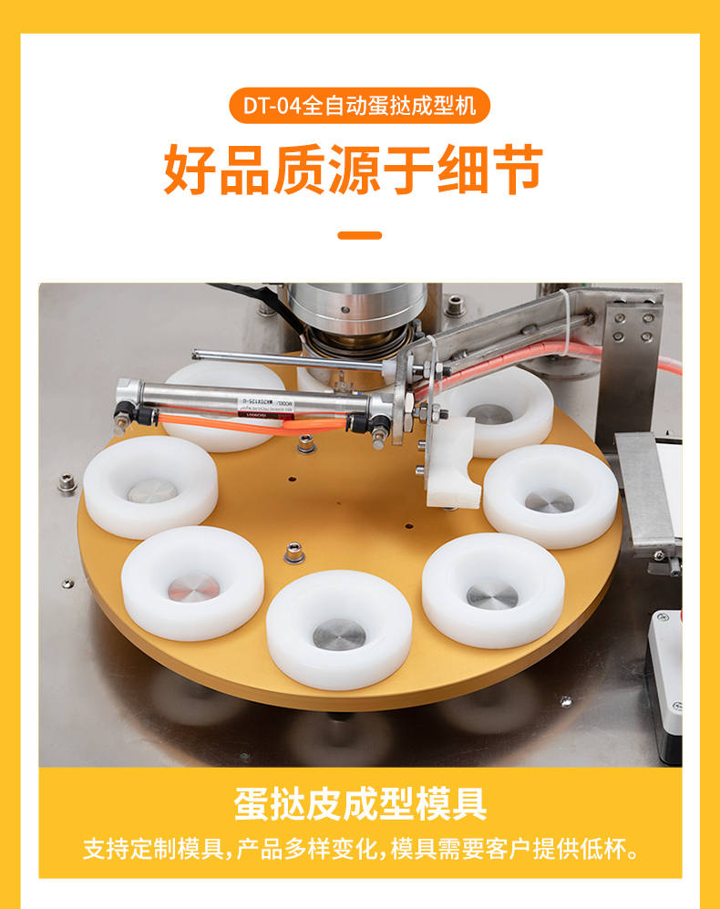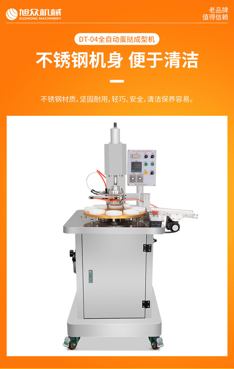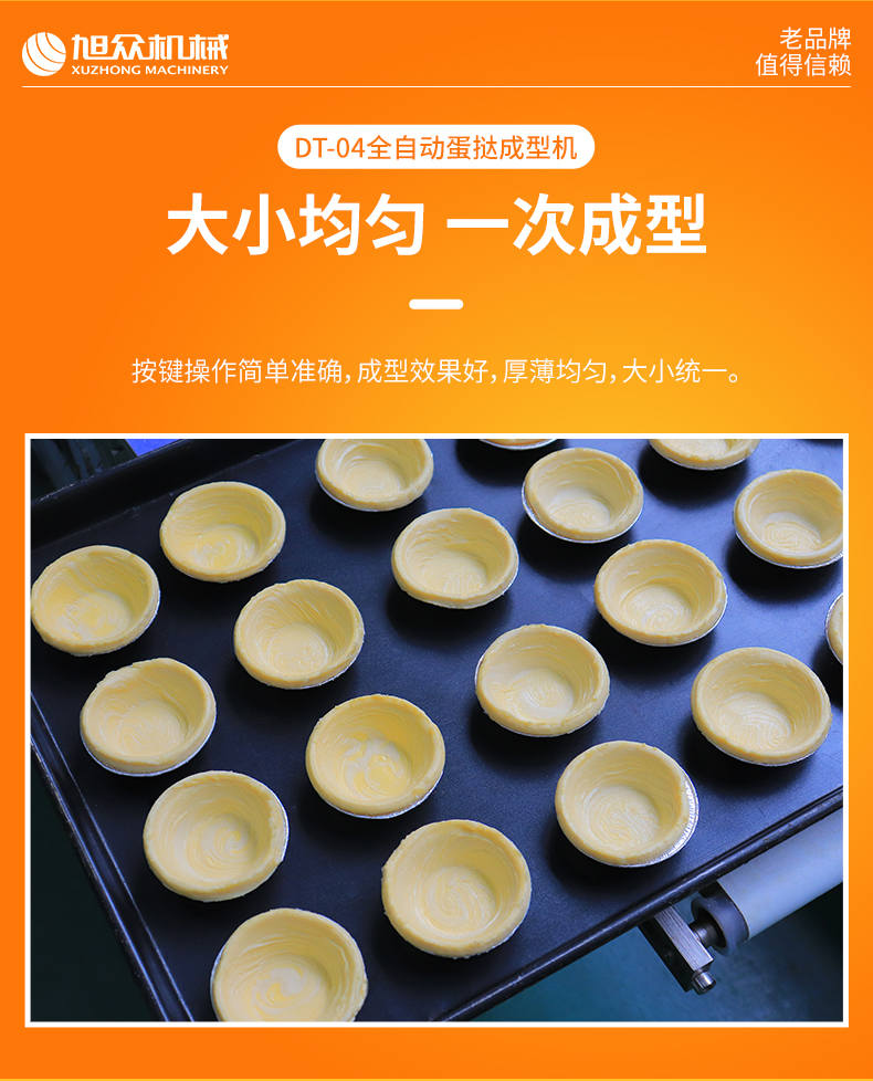 DT-04全自動蛋撻成型機(jī),2-3秒快速成型。該機(jī)應(yīng)用于傳統(tǒng)蛋撻、葡式蛋撻及其它須印型之產(chǎn)品突破傳統(tǒng)用手捏,采用微電子控制成型,一個2-3秒,高效率。大小均勻一次成型按鍵操作簡單準(zhǔn)確,成型效果好,厚薄均勻,大小統(tǒng)-。層層起酥層次分明好葡式蛋撻皮,千層酥皮、松脆可口、唇齒留香、一口難忘。