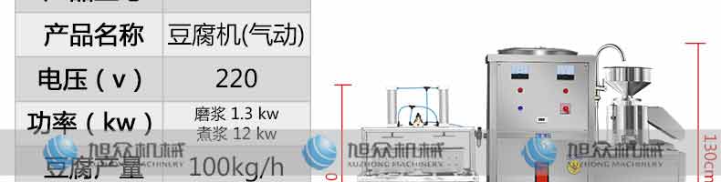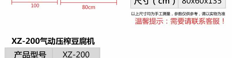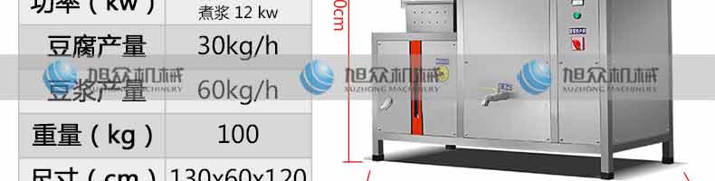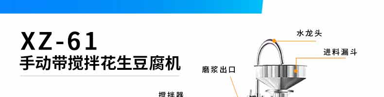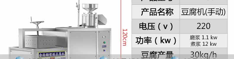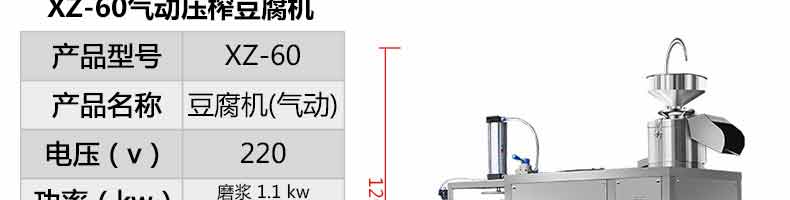 名稱xz-61手動帶攪拌花生豆腐機 電源220V 功率磨漿1.1KW,煮漿12KW 產(chǎn)量豆腐產(chǎn)量50KG/H,豆?jié){產(chǎn)量100KG/H 尺寸尺寸140*60*120mm 重量重量100KG 規(guī)格 其他