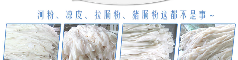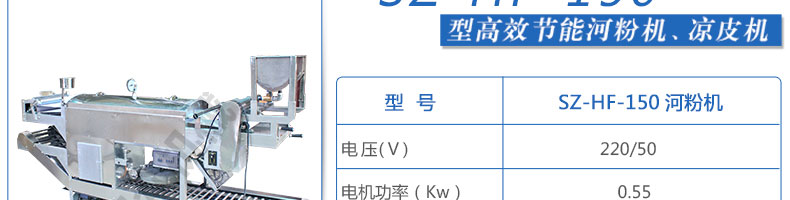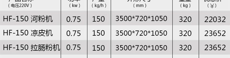 名稱(chēng)SZ-HF-150涼皮機(jī) 電源220/380V 功率0.75/41kw 產(chǎn)量60/90/120/150kg/h 尺寸主機(jī)尺寸3500*720*1050mm 外形尺寸3600*920*1500mm 重量320kg 規(guī)格粉條寬度mm:4/6/8/10 其他