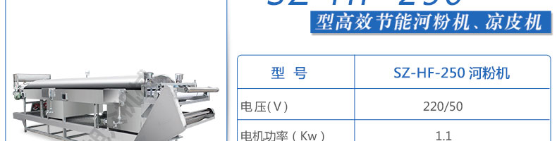 名稱SZ-HF-250涼皮機 電源220/380V 功率1.1/81kw 產(chǎn)量100/150/200/250kg/h 尺寸主機尺寸5500*1000*1050mm 外形尺寸5600*1200*1500mm 重量500kg 規(guī)格粉條寬度mm:4/6/8/10 其他
