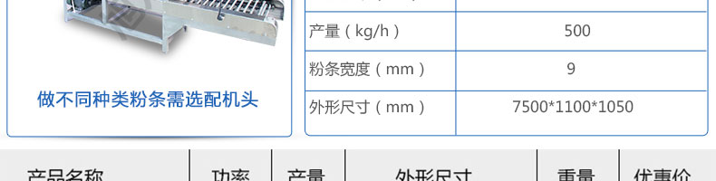 名稱SZ-HF-500涼皮機(jī) 電源220V 功率1.1kw 產(chǎn)量240/300/400/500kg/h 尺寸主機(jī)尺寸7500*1000*1050mm 外形尺寸7600*1200*1500mm 重量650kg 規(guī)格粉條寬度mm:4/6/8/10 其他