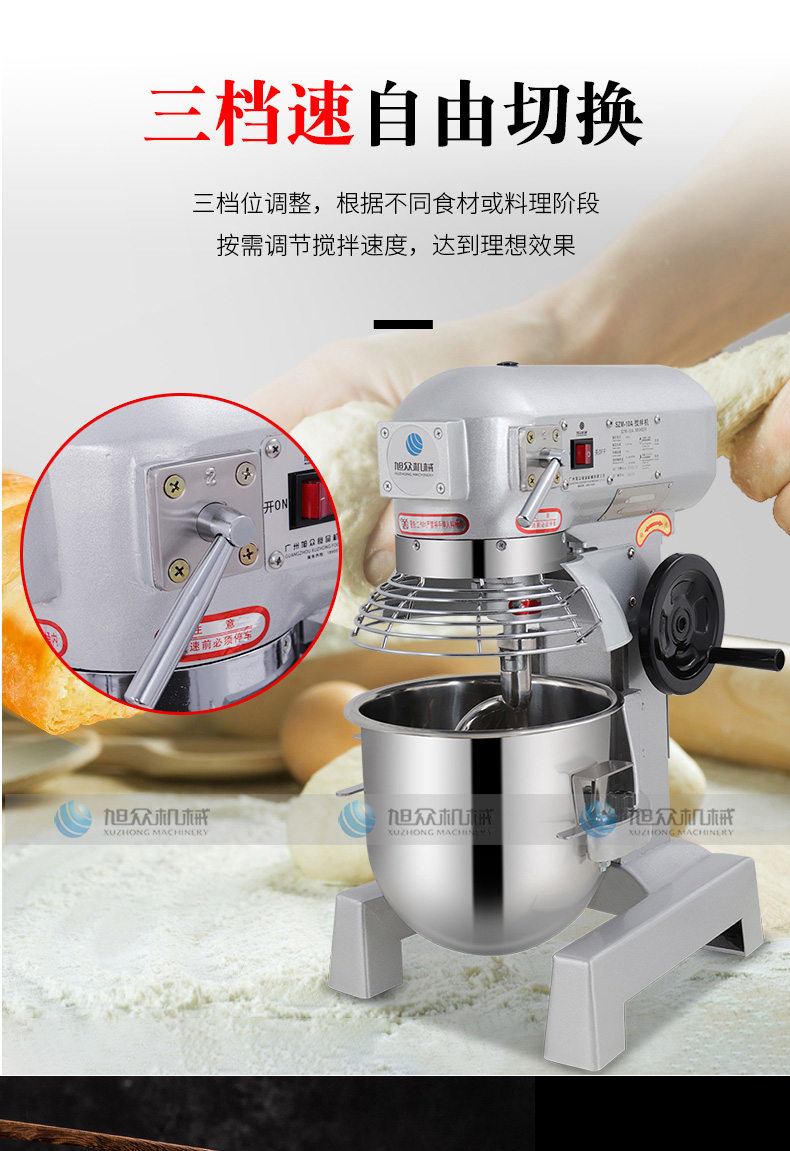 SZM-10A攪拌機,三檔速自由切換。三檔位調(diào)整,根據(jù)不同食材或料理階段按需調(diào)節(jié)攪拌速度,達到理想效果。強勁動力,源于強芯配置純銅電機,滿足高強度需求,堅固耐用大功率電機,澎湃動力,和面有力更均勻。