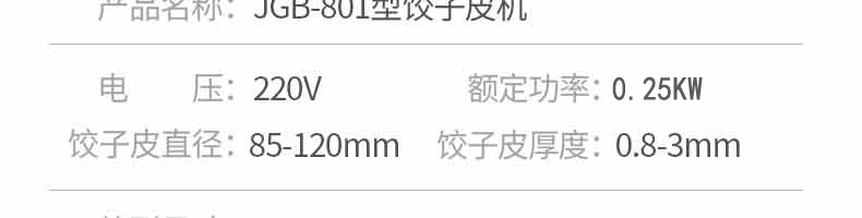 名稱801餃子皮機 電源220V 功率0.25KW 產(chǎn)量 尺寸650*380*750MM 重量 規(guī)格 其他