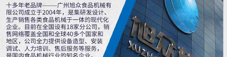 廣州旭眾食品機械有限公司是一家集科研開發(fā),生產(chǎn)設(shè)計,營銷服務(wù)為一體的現(xiàn)代化生產(chǎn)企業(yè)?,F(xiàn)代化生產(chǎn)車間,精湛制造技術(shù),所產(chǎn)機械歷經(jīng)市場重重考驗,不斷贏得海內(nèi)外客戶的贊譽。