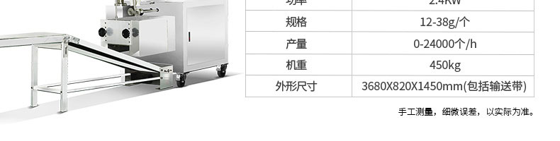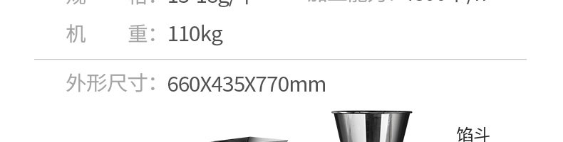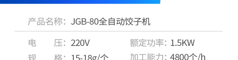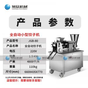 名稱80餃子機(jī) 電源220v 功率1.5kw 產(chǎn)量4800個(gè)/h 尺寸660*435*770mm 重量110kg 規(guī)格15-18g/個(gè) 其他