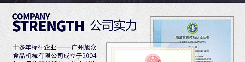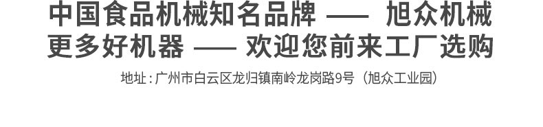 廣州旭眾食品機(jī)械有限公司是一家集科研開發(fā),生產(chǎn)設(shè)計(jì),營(yíng)銷服務(wù)為一體的現(xiàn)代化生產(chǎn)企業(yè)?,F(xiàn)代化生產(chǎn)車間,精湛制造技術(shù),所產(chǎn)機(jī)械歷經(jīng)市場(chǎng)重重考驗(yàn),不斷贏得海內(nèi)外客戶的贊譽(yù)。