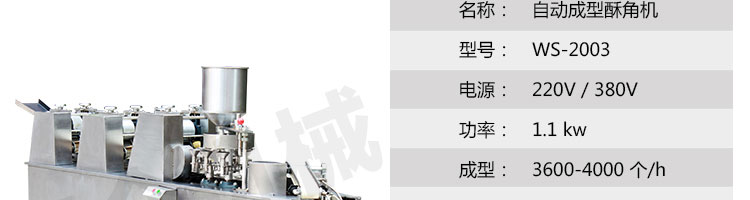 名稱WS-2003 型自動成型酥角機(jī)(油餃機(jī)) 電源220/380V 功率1.1kw 產(chǎn)量3600-4000個/小時 尺寸外形尺寸3150*500*1300mm 重量450kg 規(guī)格 其他