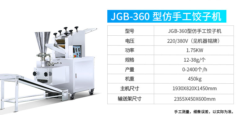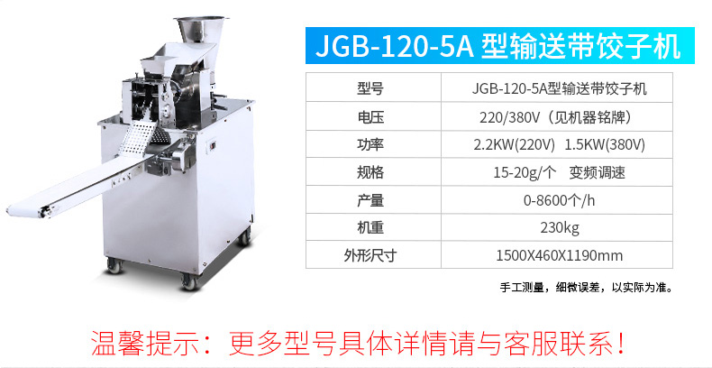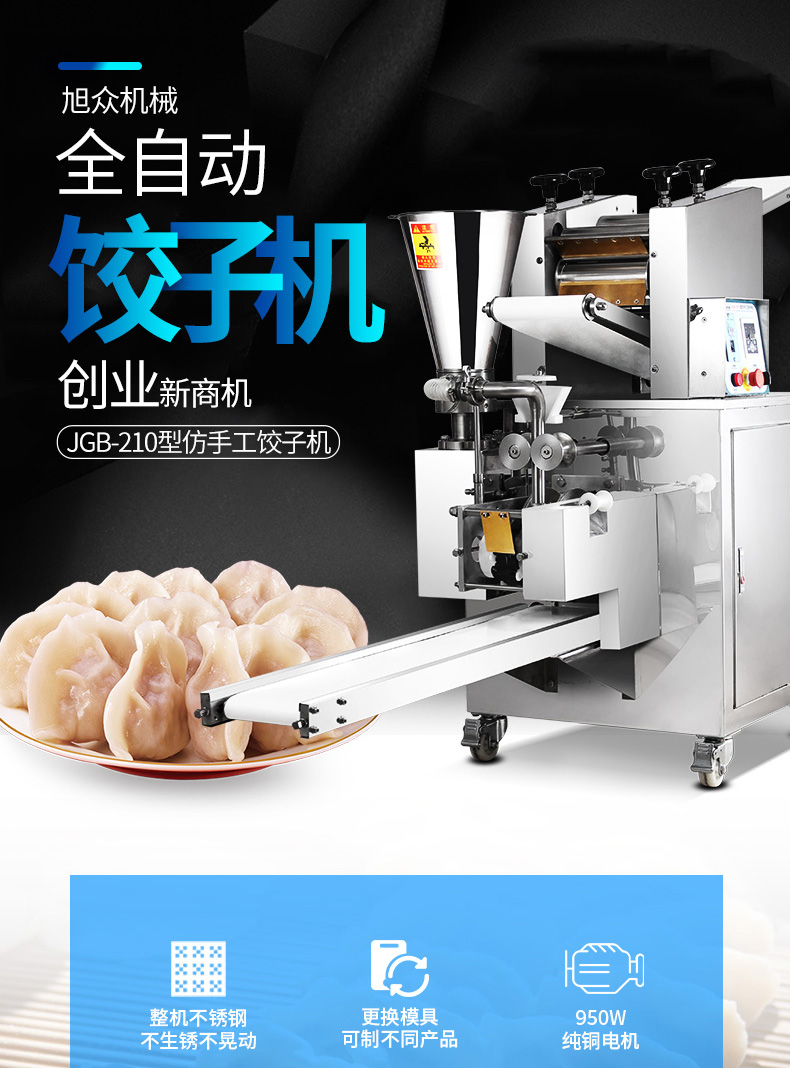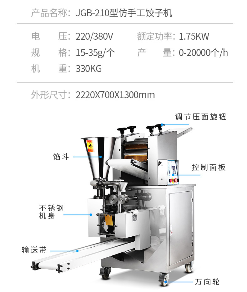 JGB-210型仿手工餃子機(jī),本機(jī)采用自動壓面皮包餃子的新工藝技術(shù),本機(jī)可生產(chǎn)速凍餃子等,能生產(chǎn)各種肉餡、肉菜混合餡、全菜餡及其他種餡的餃子,適用于餃子館、食品生產(chǎn)廠家、賓館、飯店、餐廳、團(tuán)體食堂、學(xué)校、部隊。免費上門安裝調(diào)試,贈送面點工藝