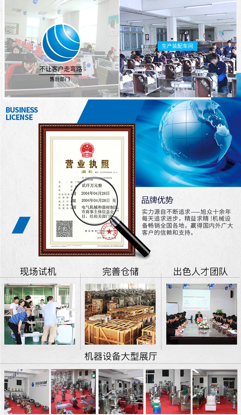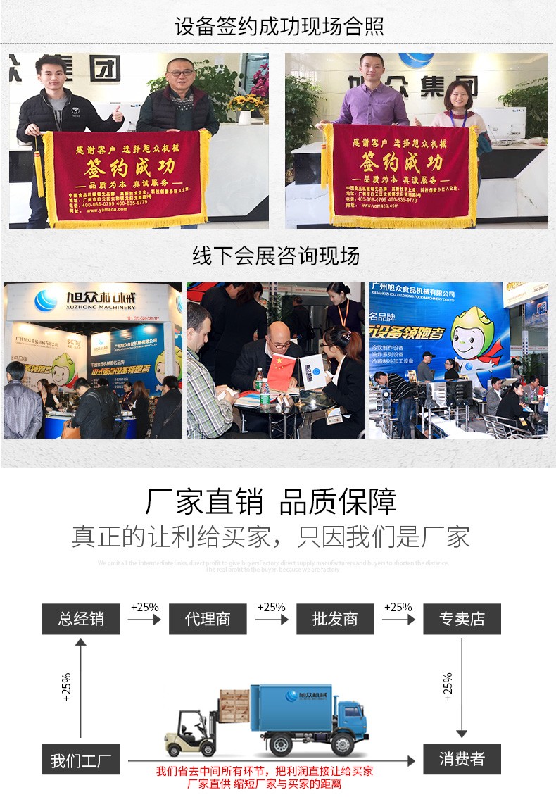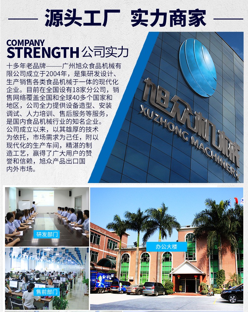 廣州旭眾食品機(jī)械有限公司是一家集科研開發(fā),生產(chǎn)設(shè)計,營銷服務(wù)為一體的現(xiàn)代化生產(chǎn)企業(yè)。現(xiàn)代化生產(chǎn)車間,精湛制造技術(shù),所產(chǎn)機(jī)械歷經(jīng)市場重重考驗,不斷贏得海內(nèi)外客戶的贊譽(yù)。