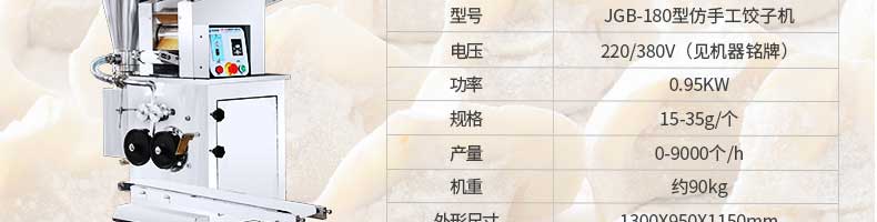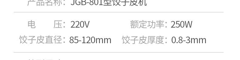 名稱(chēng)801II餃子皮機(jī) 電源220V 功率250W 產(chǎn)量各款有不同,聯(lián)系銷(xiāo)售員 尺寸650X380X750mm 重量各款有不同,聯(lián)系銷(xiāo)售員 規(guī)格餃子皮直徑:85-120mm餃子皮厚度:0.8-3mm 其他