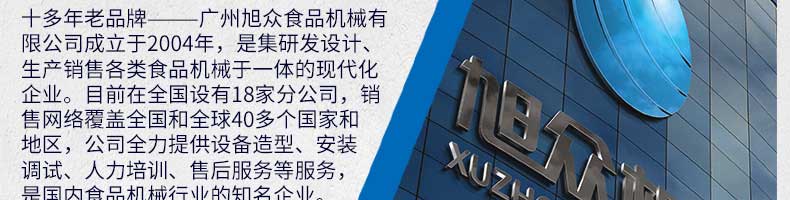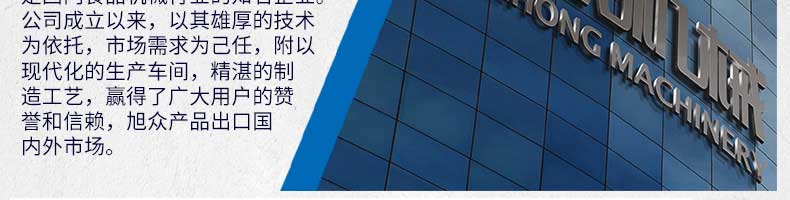 廣州旭眾食品機(jī)械有限公司是一家集科研開(kāi)發(fā),生產(chǎn)設(shè)計(jì),營(yíng)銷(xiāo)服務(wù)為一體的現(xiàn)代化生產(chǎn)企業(yè)?,F(xiàn)代化生產(chǎn)車(chē)間,精湛制造技術(shù),所產(chǎn)機(jī)械歷經(jīng)市場(chǎng)重重考驗(yàn),不斷贏得海內(nèi)外客戶(hù)的贊譽(yù)。