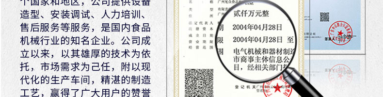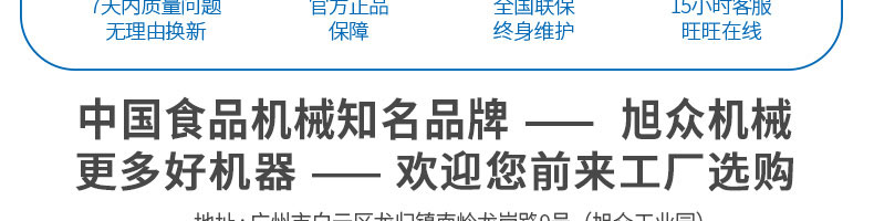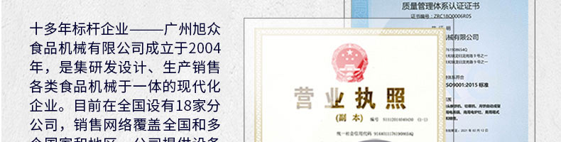 廣州旭眾食品機(jī)械有限公司是一家集科研開發(fā),生產(chǎn)設(shè)計,營銷服務(wù)為一體的現(xiàn)代化生產(chǎn)企業(yè)?,F(xiàn)代化生產(chǎn)車間,精湛制造技術(shù),所產(chǎn)機(jī)械歷經(jīng)市場重重考驗(yàn),不斷贏得海內(nèi)外客戶的贊譽(yù)。