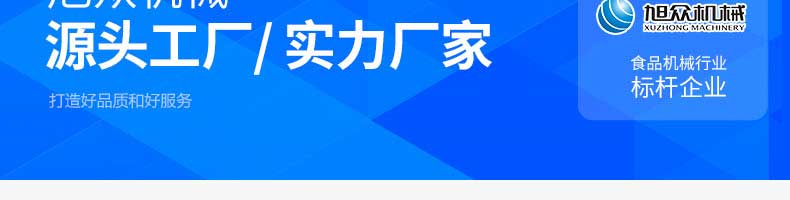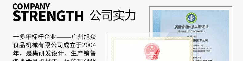 廣州旭眾食品機械有限公司是一家集科研開發(fā),生產(chǎn)設計,營銷服務為一體的現(xiàn)代化生產(chǎn)企業(yè)?,F(xiàn)代化生產(chǎn)車間,精湛制造技術,所產(chǎn)機械歷經(jīng)市場重重考驗,不斷贏得海內外客戶的贊譽。