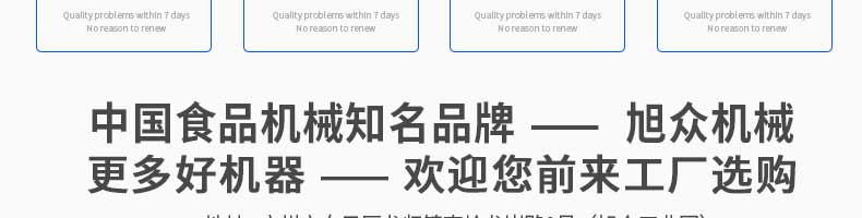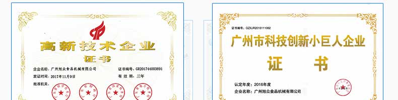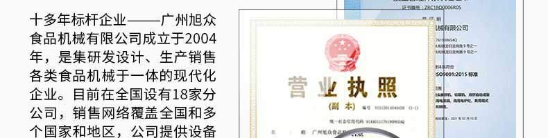 廣州旭眾食品機(jī)械有限公司是一家集科研開(kāi)發(fā),生產(chǎn)設(shè)計(jì),營(yíng)銷(xiāo)服務(wù)為一體的現(xiàn)代化生產(chǎn)企業(yè)?,F(xiàn)代化生產(chǎn)車(chē)間,精湛制造技術(shù),所產(chǎn)機(jī)械歷經(jīng)市場(chǎng)重重考驗(yàn),不斷贏得海內(nèi)外客戶(hù)的贊譽(yù)。