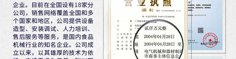 廣州旭眾食品機械有限公司是一家集科研開發(fā),生產設計,營銷服務為一體的現(xiàn)代化生產企業(yè)?,F(xiàn)代化生產車間,精湛制造技術,所產機械歷經市場重重考驗,不斷贏得海內外客戶的贊譽。
