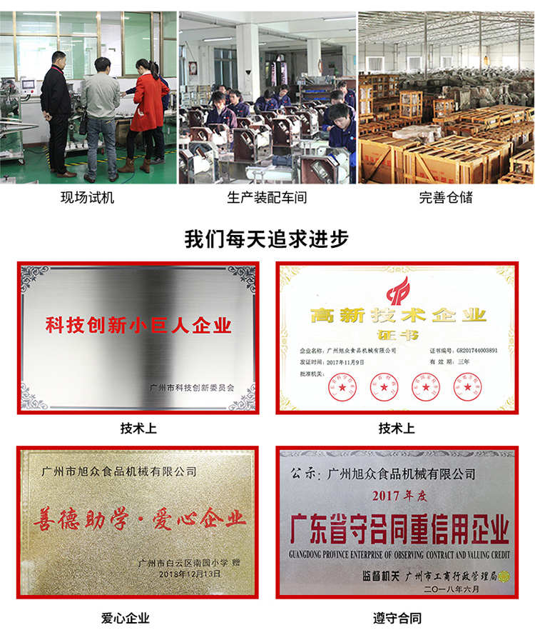 廣州旭眾食品機(jī)械有限公司是一家集科研開(kāi)發(fā),生產(chǎn)設(shè)計(jì),營(yíng)銷服務(wù)為一體的現(xiàn)代化生產(chǎn)企業(yè)?,F(xiàn)代化生產(chǎn)車間,精湛制造技術(shù),所產(chǎn)機(jī)械歷經(jīng)市場(chǎng)重重考驗(yàn),不斷贏得海內(nèi)外客戶的贊譽(yù)。