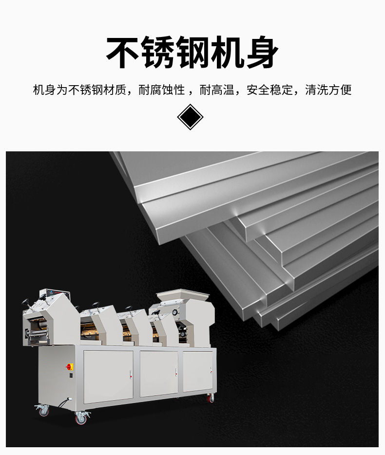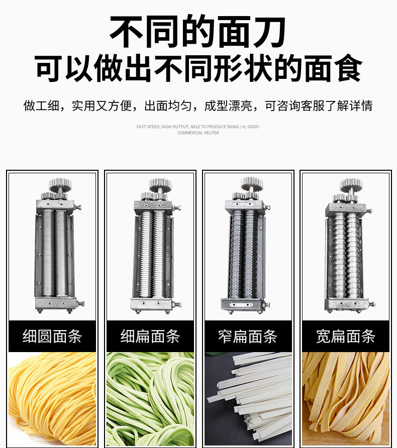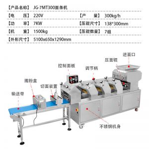 JG-7MT300面條機,多種功能一機搞定比傳統(tǒng)手工做面條,省時省力。可以做什么鮮面、蔬菜面、掛面、圓面、寬面、刀削面、波浪面等。不同的面刀可以做出不同形狀的面食做工細,實用又方便,出面均勻,成型漂亮。