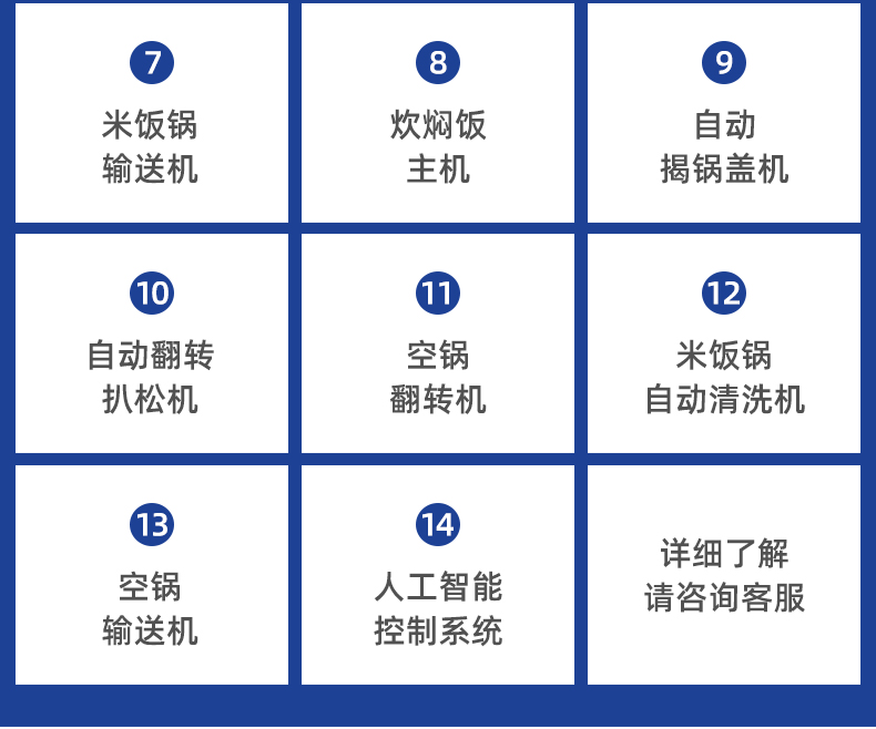 名稱(chēng)機(jī)械手全自動(dòng)米飯生產(chǎn)線 電源 380V 功率13KW 產(chǎn)量各型號(hào)不一,請(qǐng)咨詢(xún)銷(xiāo)售員 尺寸各型號(hào)不一,請(qǐng)咨詢(xún)銷(xiāo)售員 重量各型號(hào)不一,請(qǐng)咨詢(xún)銷(xiāo)售員 規(guī)格各型號(hào)不一,請(qǐng)咨詢(xún)銷(xiāo)售員 其他