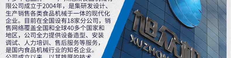 廣州旭眾食品機械有限公司是一家集科研開發(fā),生產設計,營銷服務為一體的現代化生產企業(yè)?,F代化生產車間,精湛制造技術,所產機械歷經市場重重考驗,不斷贏得海內外客戶的贊譽。