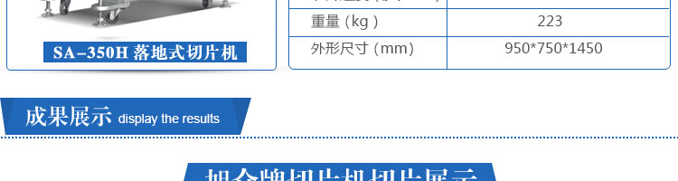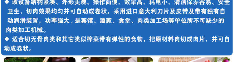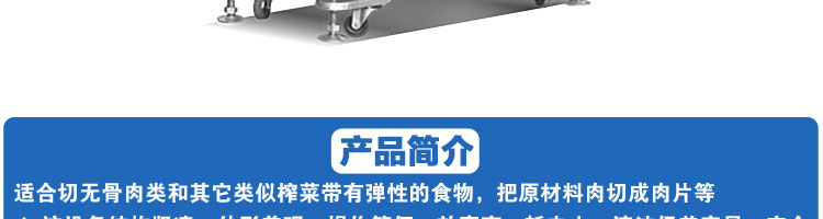 SA-350H 全自動(dòng)落地式切片機(jī),適合切無(wú)骨肉類和其他類似榨菜帶有彈性的食物,把原材料肉切成肉片,并可自動(dòng)成卷狀??汕信H馄?、羊肉片等
