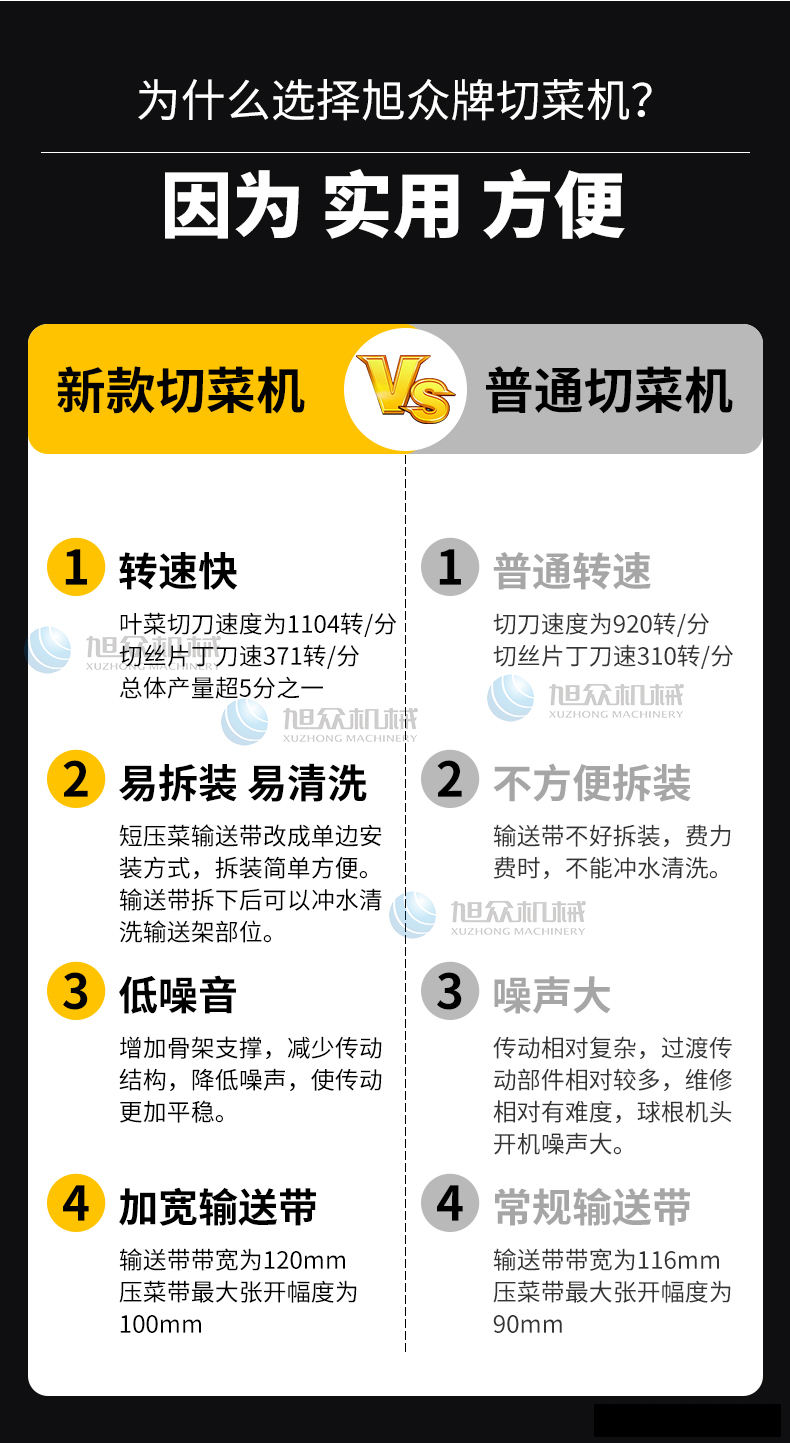 XZ-688A切菜機(jī),占地使用面積小機(jī)器小,省空間,適合飯店、食堂、酒店等使用。省事省力省人工1小時加工2000斤葉菜切刀速度為1104轉(zhuǎn)/分,切絲、切片、切丁、刀速371轉(zhuǎn)/分。