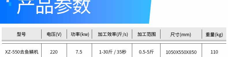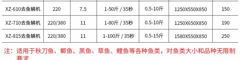 名稱XZ-710去魚鱗機 電源220V/380V 功率3.0kw/2.2kw 產(chǎn)量1-80斤/35秒 尺寸1250×650×850mm 重量190kg 規(guī)格 其他加工范圍:0.5-10斤