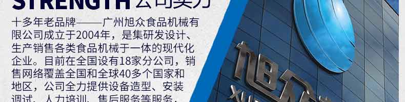 廣州旭眾食品機(jī)械有限公司是一家集科研開發(fā),生產(chǎn)設(shè)計(jì),營(yíng)銷服務(wù)為一體的現(xiàn)代化生產(chǎn)企業(yè)?,F(xiàn)代化生產(chǎn)車間,精湛制造技術(shù),所產(chǎn)機(jī)械歷經(jīng)市場(chǎng)重重考驗(yàn),不斷贏得海內(nèi)外客戶的贊譽(yù)。
