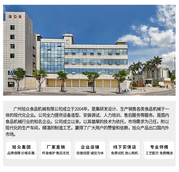 廣州旭眾食品機(jī)械有限公司是一家集科研開發(fā),生產(chǎn)設(shè)計(jì),營銷服務(wù)為一體的現(xiàn)代化生產(chǎn)企業(yè)?,F(xiàn)代化生產(chǎn)車間,精湛制造技術(shù),所產(chǎn)機(jī)械歷經(jīng)市場重重考驗(yàn),不斷贏得海內(nèi)外客戶的贊譽(yù)。