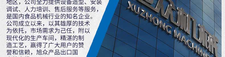 廣州旭眾食品機(jī)械有限公司是一家集科研開發(fā),生產(chǎn)設(shè)計(jì),營(yíng)銷服務(wù)為一體的現(xiàn)代化生產(chǎn)企業(yè)?,F(xiàn)代化生產(chǎn)車間,精湛制造技術(shù),所產(chǎn)機(jī)械歷經(jīng)市場(chǎng)重重考驗(yàn),不斷贏得海內(nèi)外客戶的贊譽(yù)。