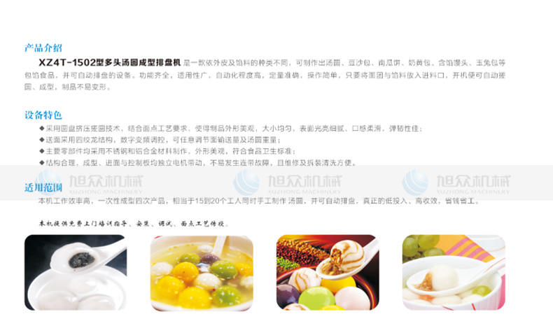 名稱XZ4T -1502多頭湯圓成型排盤機(jī) 電源220/380V(見機(jī)器銘牌) 功率4.5KW 產(chǎn)量0-15000個/h 尺寸2600x1200x1600mm 重量950kg 規(guī)格22-30mm(直徑) 其他
