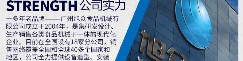 廣州旭眾食品機(jī)械有限公司是一家集科研開(kāi)發(fā),生產(chǎn)設(shè)計(jì),營(yíng)銷(xiāo)服務(wù)為一體的現(xiàn)代化生產(chǎn)企業(yè)?,F(xiàn)代化生產(chǎn)車(chē)間,精湛制造技術(shù),所產(chǎn)機(jī)械歷經(jīng)市場(chǎng)重重考驗(yàn),不斷贏得海內(nèi)外客戶的贊譽(yù)。