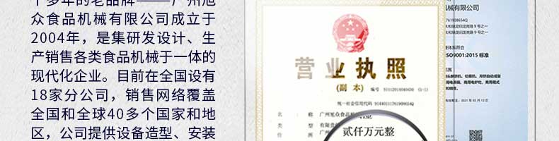 廣州旭眾食品機(jī)械有限公司是一家集科研開發(fā),生產(chǎn)設(shè)計(jì),營(yíng)銷服務(wù)為一體的現(xiàn)代化生產(chǎn)企業(yè)?,F(xiàn)代化生產(chǎn)車間,精湛制造技術(shù),所產(chǎn)機(jī)械歷經(jīng)市場(chǎng)重重考驗(yàn),不斷贏得海內(nèi)外客戶的贊譽(yù)。