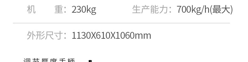 名稱350A壓面機(jī)-380v 電源380v 功率2.2kw 產(chǎn)量700kg/h 尺寸1130*610*1060mm 重量 規(guī)格壓面寬度:<350mm 其他