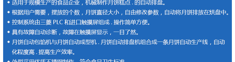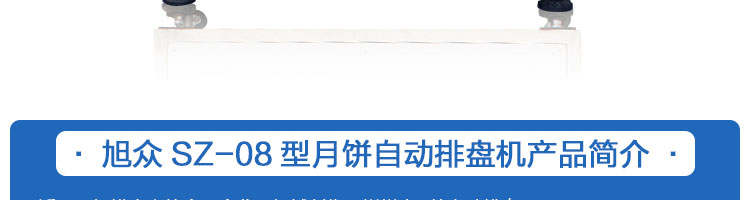 名稱SZ-08型月餅自動排盤機 電源220V 功率1.1kw 產(chǎn)量30-100個/分鐘 尺寸外形尺寸1320*1000*1120mm,裝上輸送架尺寸1320*1820*1230mm 重量360kg 規(guī)格10-200克/個 其他