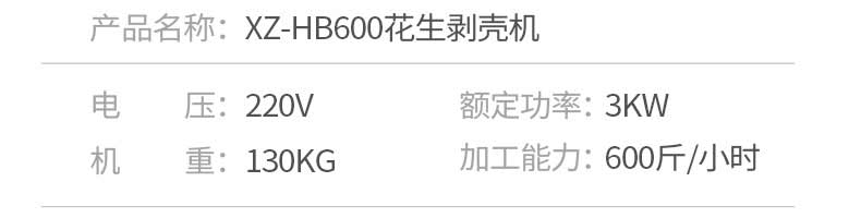 名稱花生脫殼機(jī) 電源220V 功率3kw 產(chǎn)量600斤/h 尺寸1200×680×1650mm 重量130kg 規(guī)格 其他
